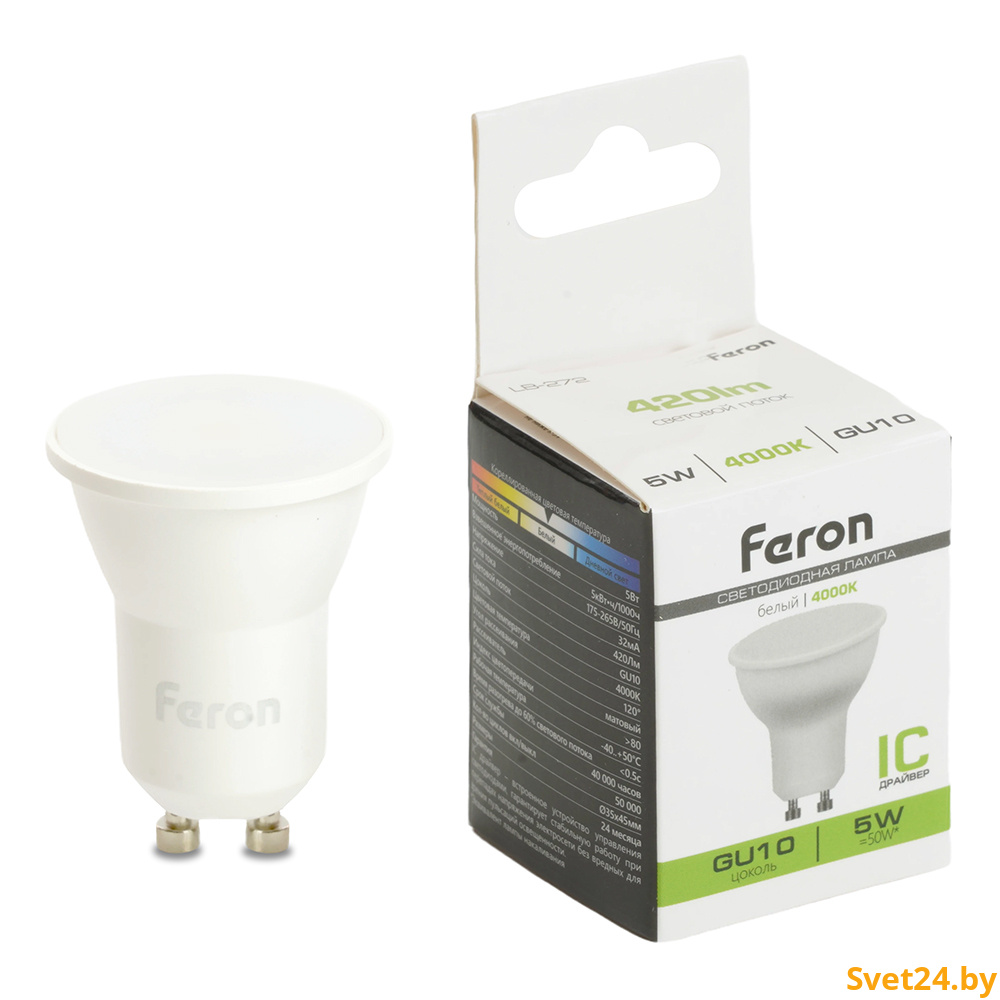 Лампа светодиодная FERON LB-272, MR11 (рефлекторная), 5W 175-265V GU10 4000К (белый), рассеиватель матовый белый, 420Lm, угол рассеивания 120°, 45*35мм