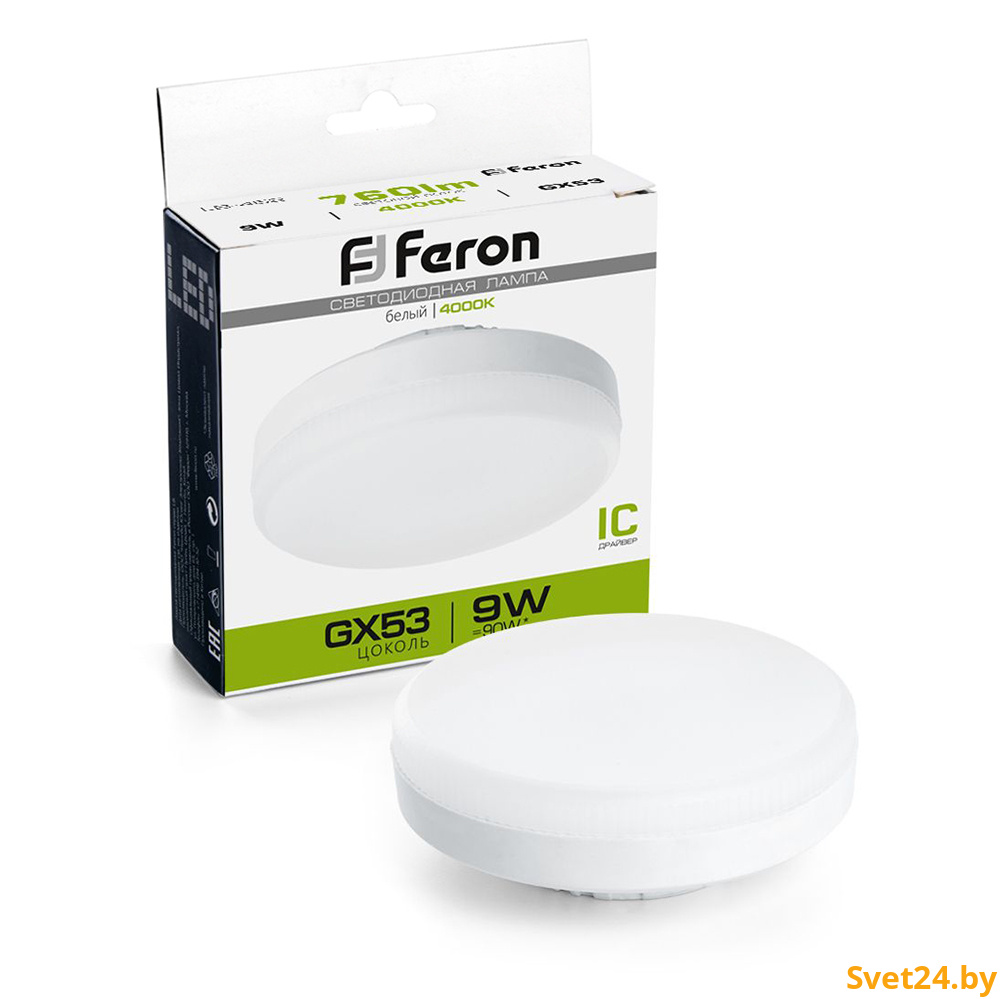 Лампа светодиодная FERON LB-452, GX53 (таблетка), 9W 175-265V GX53 4000К (белый), рассеиватель матовый белый, 760Lm, угол рассеивания 120°, 26*73мм