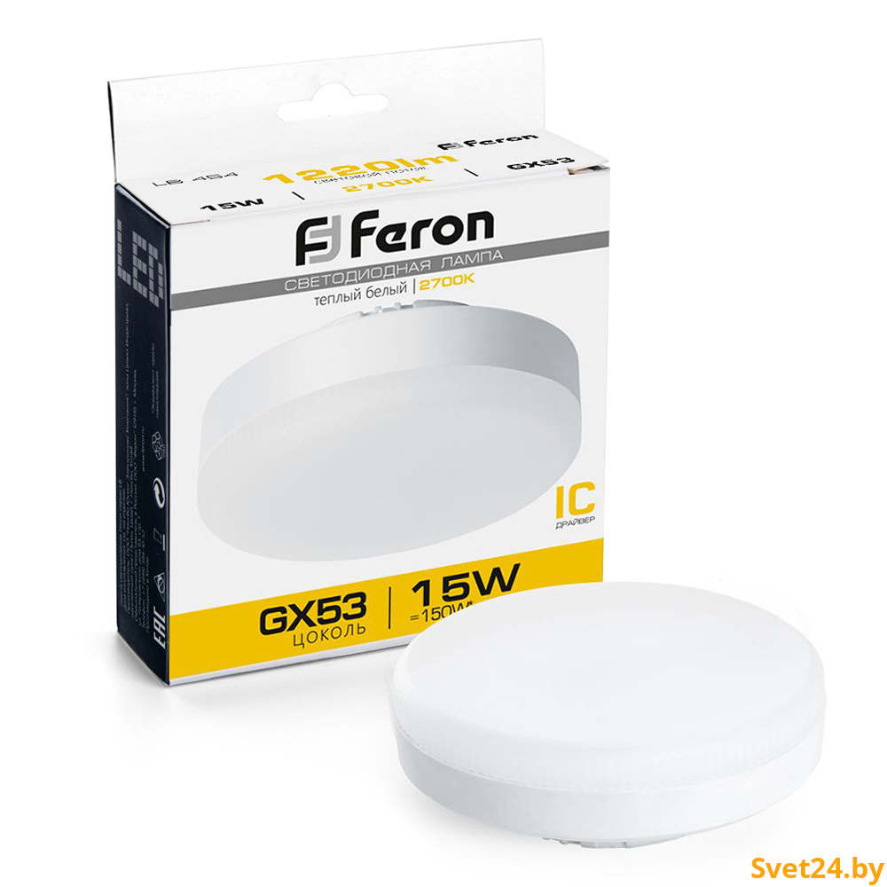 Лампа светодиодная FERON LB-454, GX53 (таблетка), 15W 175-265V GX53 2700К (белый теплый), рассеиватель матовый белый, 1220Lm, угол рассеивания 120°, 28*73мм